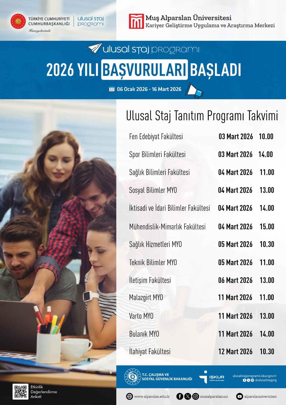 Üniversitemiz öğrencilerinin staj imkânlarından etkin bir şekilde haberdar olabilmelerini sağlamak amacıyla, tüm fakülte ve meslek yüksekokullarında Ulusal Staj Programı kapsamında 2 Şubat-13 Şubat 2026 tarihleri arasında tanıtım faaliyetleri gerçekleştirilecektir.